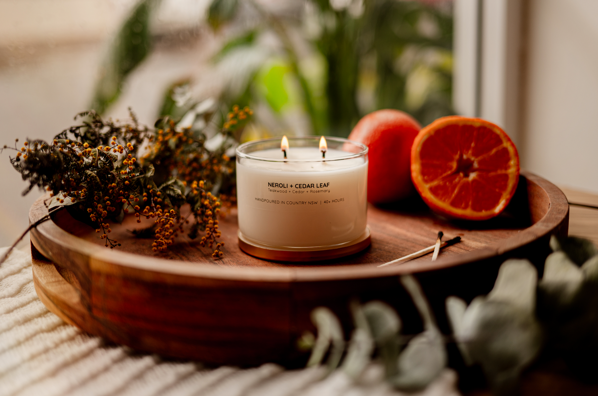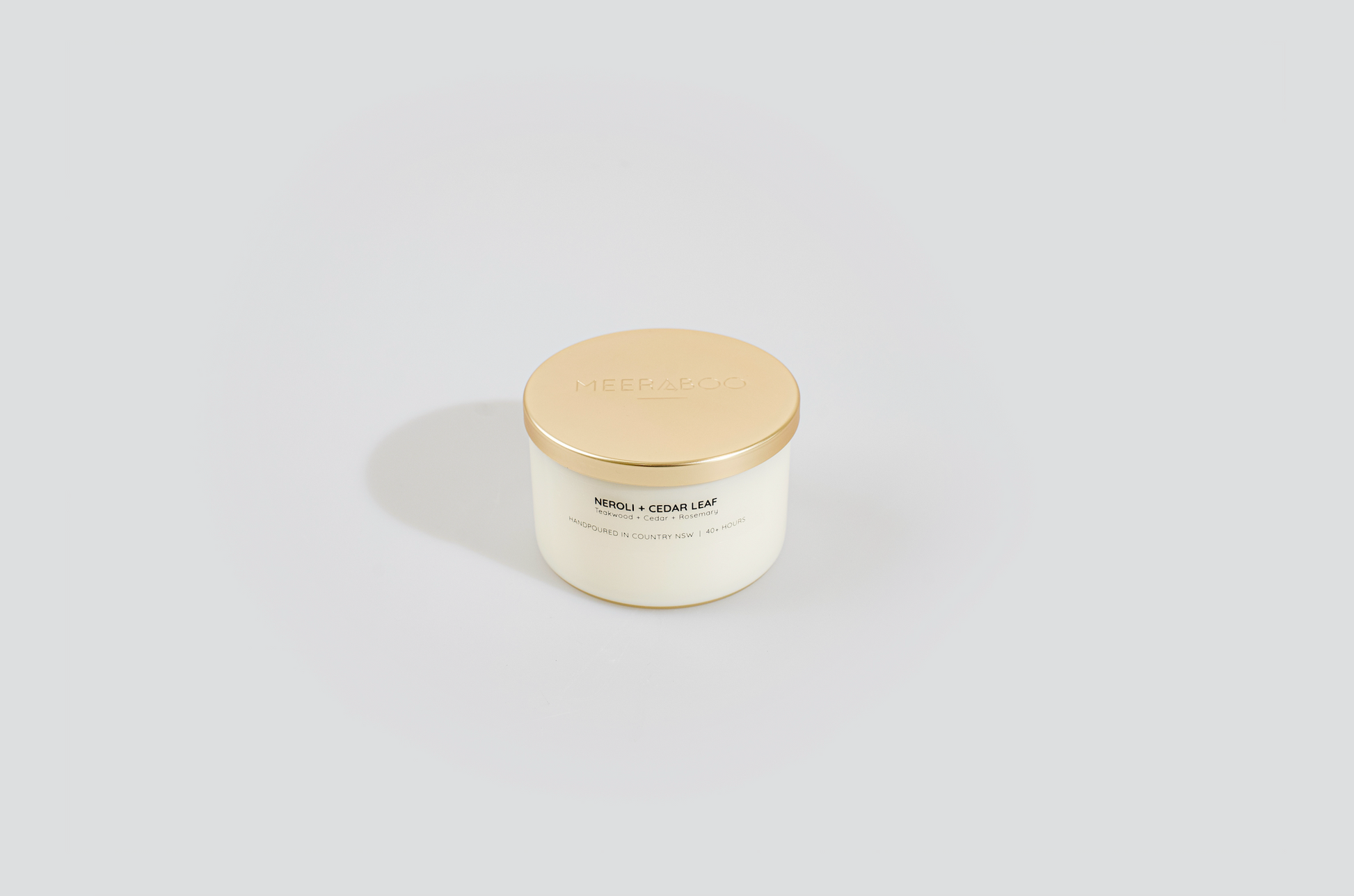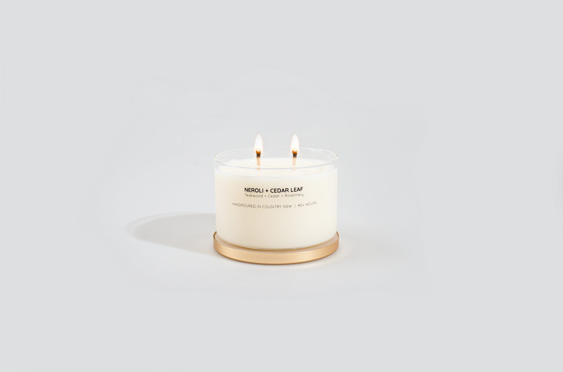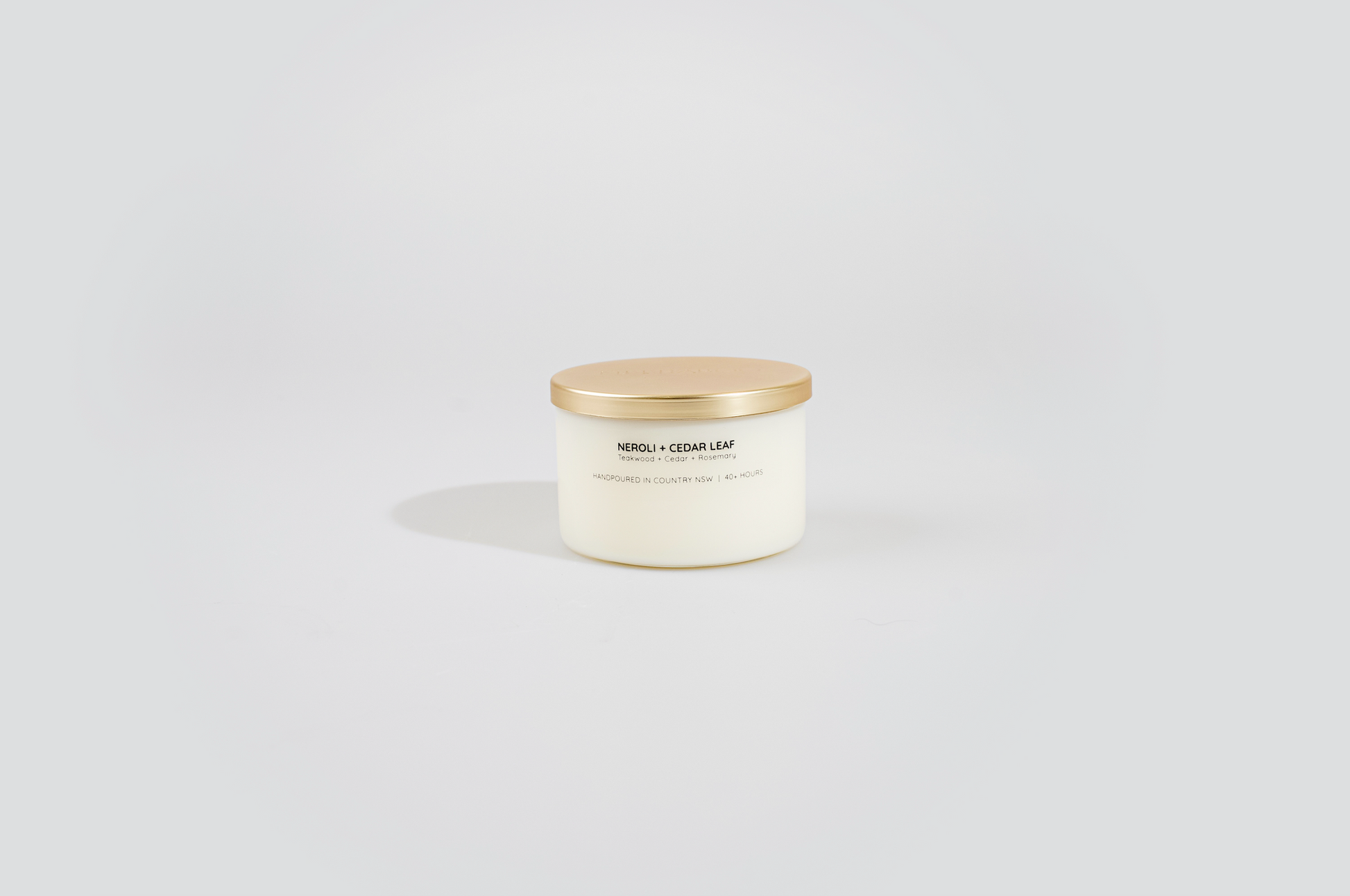 Bougie à la cire de soja avec couvercle doré au néroli et à la feuille de cèdre